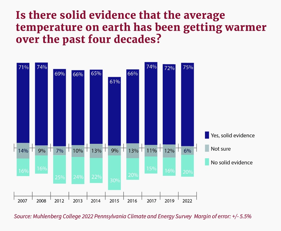 - Three out of four Pennsylvanians (75%) indicate that there is solid evidence that temperatures on earth have risen over the past four decades, marking the highest level of acceptance of global warming among residents of the state since measurement began in 2007.