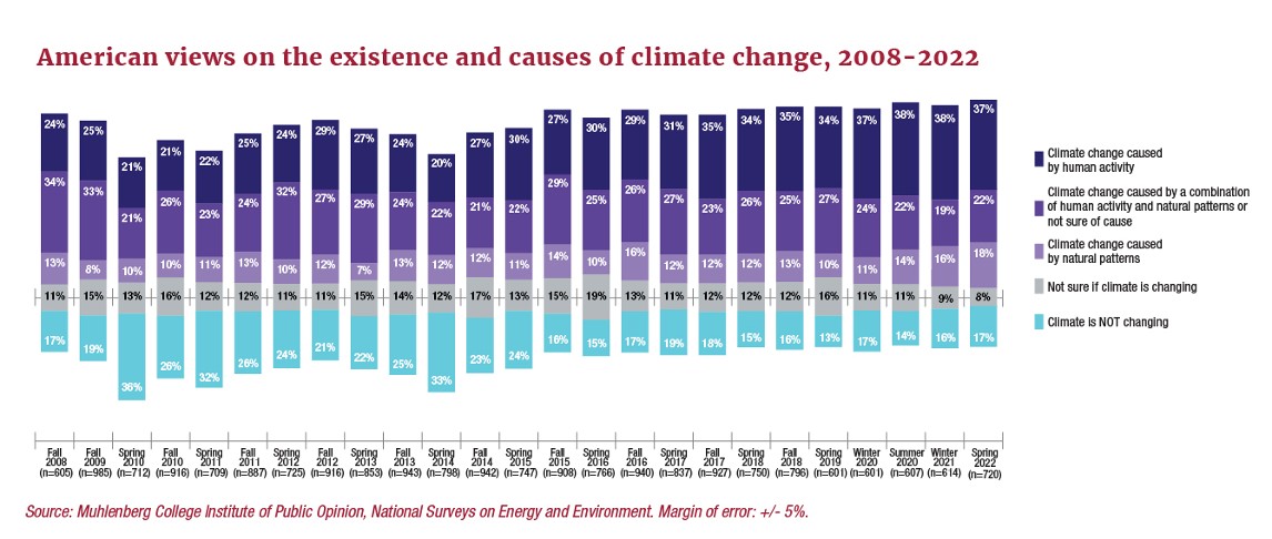 The latest NSEE results show that just under 6 out of 10 Americans (59%) think that there is solid evidence of global warming and that the warming is being at least partially caused by human activity. This result marks the 12th consecutive NSEE wave, dating back to 2015, in which a majority of adult Americans expressed the view that human activity is altering the planet’s climate. In the 2022 findings, 37% of Americans indicated that there is solid evidence of a warming planet, and that the warming is caused primarily by human activity. An additional 22% of Americans agreed there is solid evidence of global warming, and that humans are at least partially responsible for these changes. Notably, nearly 1 in 5 adult Americans (18%) indicate that while there is solid evidence of global warming, the warming is the result of a natural cycle. The 18% level marks the highest portion of Americans to fall into this category since the inception of the NSEE in 2008.