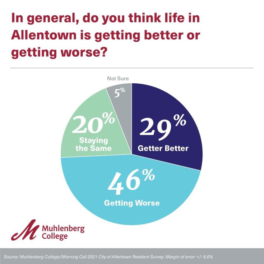 - While most Allentown residents give the city a positive rating as a place to live, more (46%) say life in the city is getting worse than say it is getting better (29%). This is a reversal from 2017 when most residents (53%) of the city indicated that life in Allentown was getting better, and only 27% said it was getting worse.