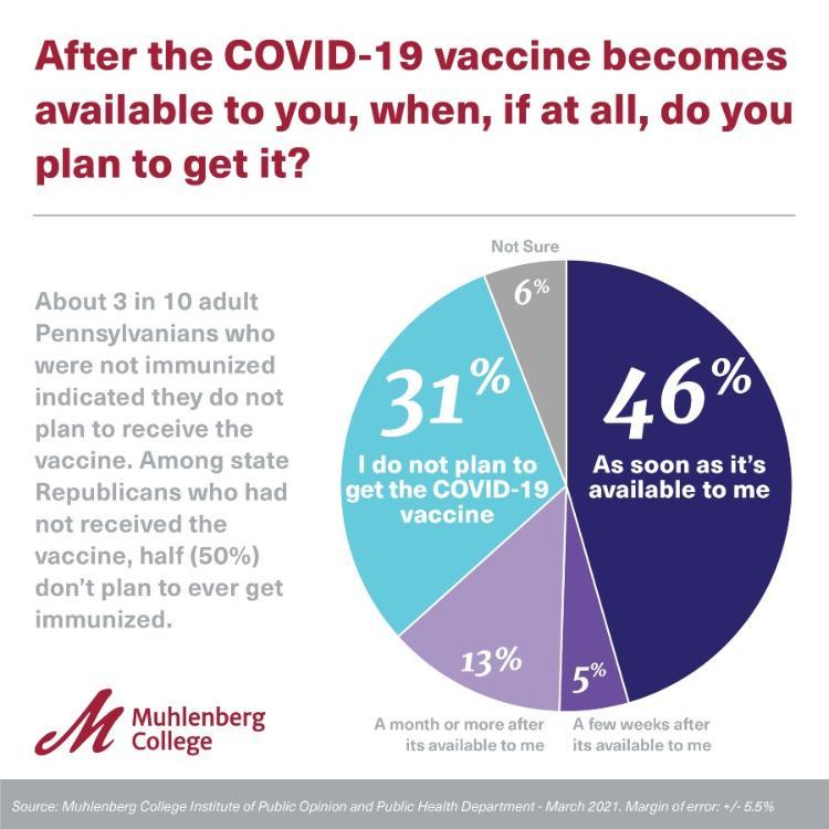 "Among Pennsylvanians that have not yet received a COVID-19 vaccine, most plan to become immunized," says Chris Borick, director of the Institute of Public Opinion. "However a significant portion of unimmunized residents of the state, and particularly those that are registered Republicans, indicate they do not plan to ever receive the vaccine."