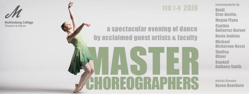 This year's "Master Choreographers" features original works by three guest choreographers: Kevin Jenkins, Michael Nickerson-Rossi, and Cynthia Gutierrez-Garner, as well as new works by four Muhlenberg dance faculty: Heidi Cruz-Austin, Megan Flynn, Shelley Oliver, and Randall Anthony Smith.