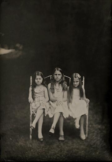 During the lockdown, Burke turned her camera inward, focusing on her family, specifically her three young daughters. Using traditional photographic processes such as wet collodion, tintype, pin-hole photography, and other filmic methods, she’s created a fantastical world of staged portraits of her girls. Victorian looking outfits and props are common, and the technique she’s using feeds into a romantic nostalgia for a pre-pandemic past.