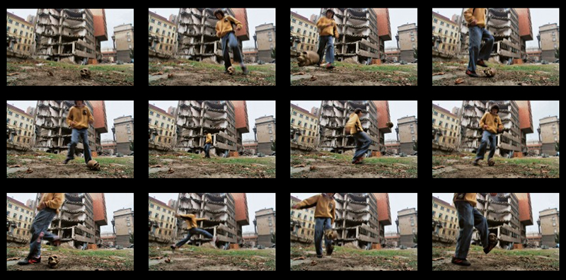 A young man enters the screen, and immediately flicks up a most unusual ball, attempting to juggle it in the air for as many hits as possible. The ball rolls away and is swiftly brought back to center-frame. Quickly, we realize it’s not a ball, but what appears to be a human skull. The action is set against a backdrop of half demolished buildings, and we hear the child panting, shuffling, and straining against traffic noise in the distance. The extraordinary is superimposed on the everyday, provoking a host of unsettling associations.