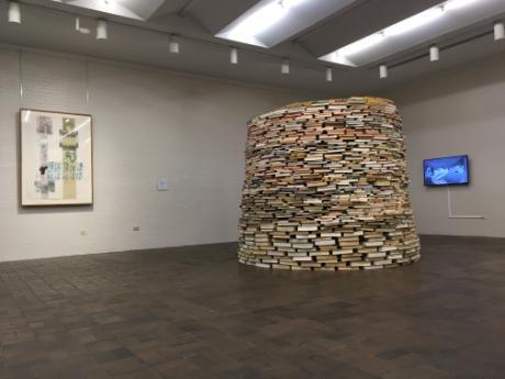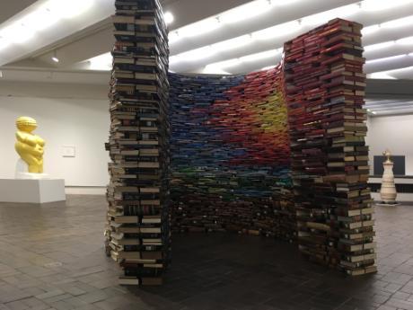 In his more recent Conversations (2004 – present), structures have focused on surface image, disregarding subject. TheseConversations use book spine color as physical pixel to focus on over-all image. Indexing by color creates unexpected connections between books, as subject and title is left to chance. A detective novel abuts a text on accounting, sharing onlycover color in common. These radical juxtapositions make for a kind of three-dimensional flarf poetry. In Bendtsen’s work however, there is no cutting or pasting, as books are stacked without adhesive, bound together only by gravity. Tomes become an essential building block; that his structures are unsecured makes them inherently fragile, preserving the potential for collapse.