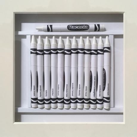 Walker uses the dark history of Crayola’s infamous “Flesh”1 colored crayon as a point of departure for her colorful and provocative workThe White Crayon (2008). Her piece explores stereotypes, labels, and personal and institutional power using the parody brand, Raceola. In this alternate universe, white crayons are given color names based on derogative slang for poor or rural Caucasian [white] communities. Keeping her intention deliberately ambiguous, Walker anticipates the inflammatory All Lives Matter response to the Black Lives Matter movement, where questions of compassion and oppressed/oppressor are ironically inverted and tried in the court of public opinion. Owing to her upbringing in rural Virginia, Walker treads a fine line in this questionably sympathetic portrayal of the struggles that economically left behind communities endure.