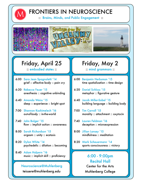 The series serves as an opportunity for students to critically explore topics within neuroscience that can appeal to a non-scientific audience. On April 25, the presentations focus on embodied states, which includes feelings, sleep, psychosis, and out-of-body experiences. The May 2nd talks focus on cognitive themes that examine ways of thinking and mapping the mind in different ways. Each individual talk is allotted a specific time slot, and students and community members are encouraged to visit any or all talks that interests them.