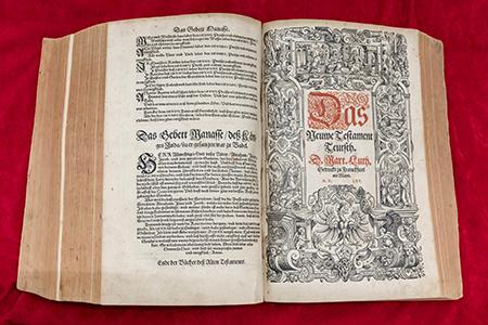 The first complete “Luther Bible” was published in 1534 by Hans Lufft of Wittenberg, and was a collaborative effort shared by Melanchthon, Caspar Cruezigar and others. Luther continued to revise the work until his death in 1546, when a revision was published. This 1565 edition is the earliest Luther translation that the library holds.
