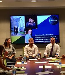 This is just one of the stories Doyle shares with the 10 current students who came to visit his workplace, Ketchum. The public relations firm was one of six places students could visit on the second annual Career Road Trip to New York City. Doyle is a charismatic teller of tales, and as regional president of Ketchum North America, he has built a career using his gift to help clients shape their own narratives. And while he didn’t set out to work in public relations, he credits his Muhlenberg degree—in English and psychology—with preparing him for the field.