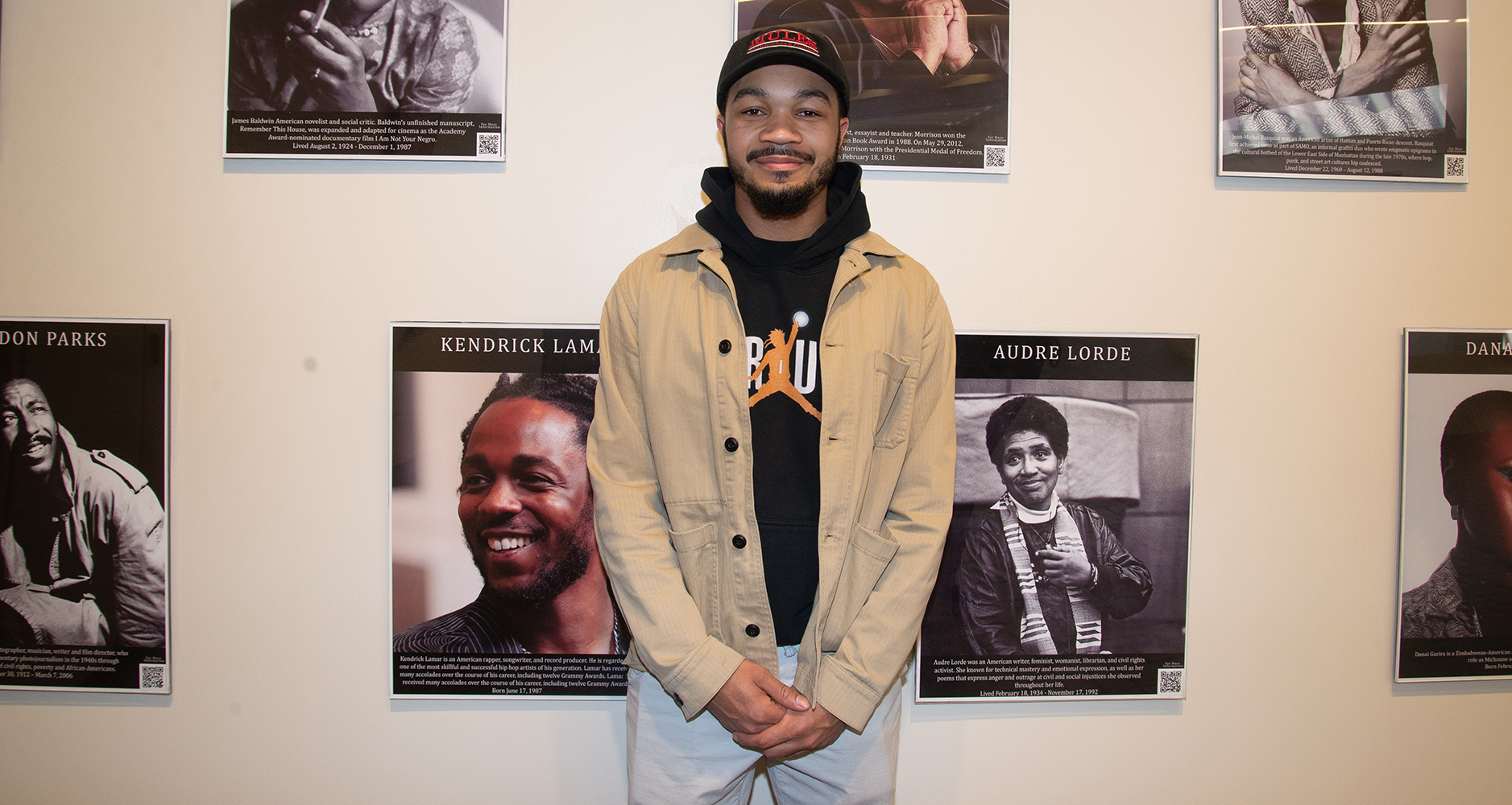 Steven Smith '19 with the portion of his Black History Month poster exhibit that appears in the Baker Center for the Arts. Photo by Phelize Bristol ’19.If you've been to Seegers Union, the Life Sports Center or the Baker Center for the Arts this month, you've likely seen the Black Individuals Throughout The Ages poster exhibit curated by Steven Smith '19. Smith, a psychology major with a creative writing minor, approached Robin Riley-Casey, director of the Office of Multicultural Life, with the idea.