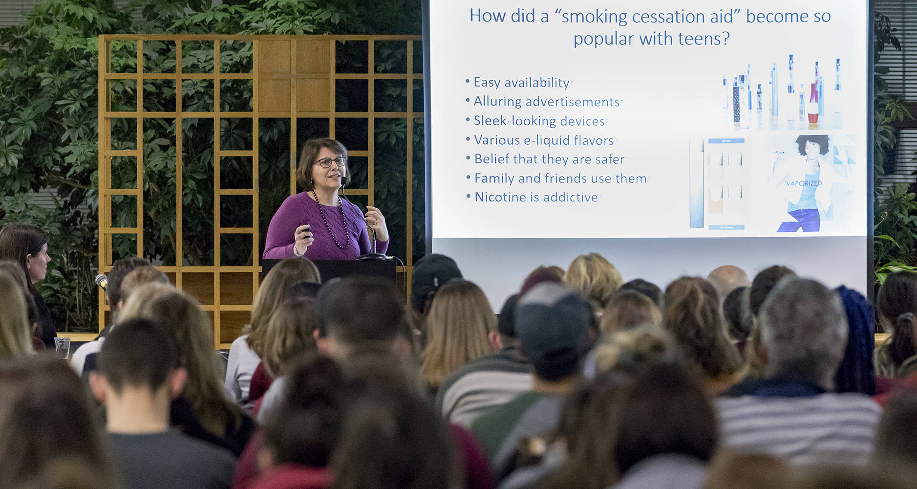 Next, Cronin talked about what we do know: that vaping nicotine is highly addictive. Between 2011 and 2015, e-cigarette use in high school students increased by 900 percent, and just over the course of last year, it increased by 78 percent. “We’re not really sure how to get them unaddicted,” Cronin said. “We don’t have any vaping cessation program data. We don’t know if what we use for tobacco cessation is going to be effective for vaping.” She added that there’s no data regarding whether vaping fluid is safe or unsafe. It can contain dangerous heavy metals (such as lead), and companies won’t reveal some “proprietary chemicals” in the fluid. “If they’re not harmful, why don’t you tell us?” she said.