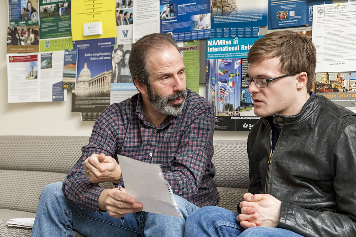 Political Science Professor Chris Borick and Stuart Bibeau ’19 meet to discuss Bibeau's senior thesis on switch-ticket voters.In the aftermath of the 2016 presidential election, one thing stood out as especially interesting to Stuart Bibeau ’19, a history and political science double major: “There are voters out there who voted for Obama in 2012 and Trump in 2016,” he says, “even though their platforms and demeanors are very different.”