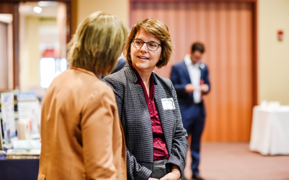 Muhlenberg Assistant Professor and Director of Public Health Chrysan Cronin (right) speaks with President Kathleen Harring at the radon and public health workshop.