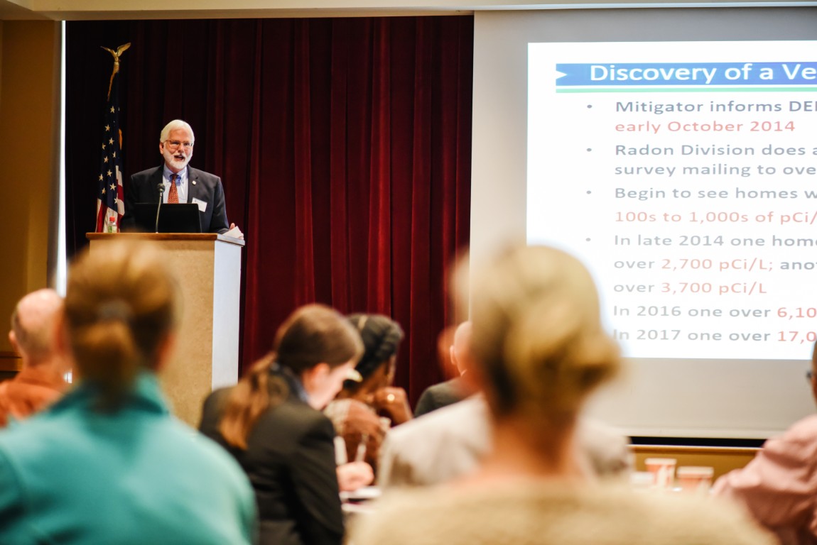 Dave Allard, Director of the Bureau of Radiation Protection, Pennsylvania Department of Environmental Protection, speaks at Muhlenberg College.On October 11, Muhlenberg hosted the “Lehigh Valley Community-Campus Coalition Building: Radon & Public Health Workshop,” which brought together over 50 local, state and federal stakeholders—including community partners, medical and public health practitioners, academics and legislators—to focus on the serious public health threat from indoor radon in Pennsylvania.