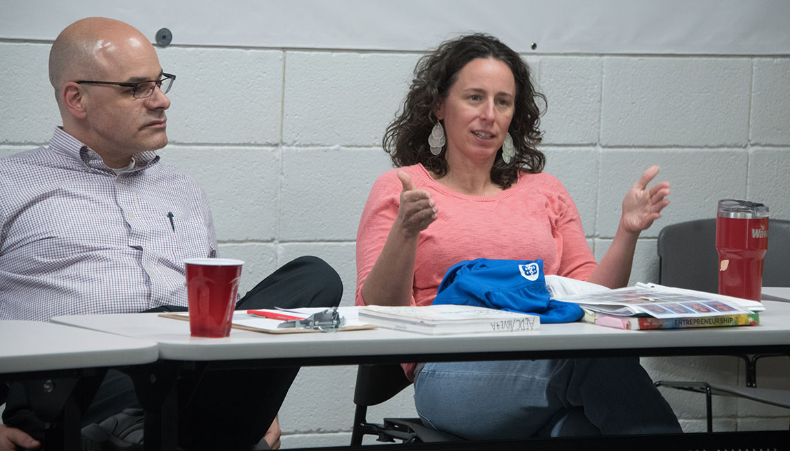 The class sessions include some lectures, some teamwork on the businesses and the occasional visiting expert. One guest this semester was Anthony Durante (pictured, with Chesterton) from the Allentown Economic Development Corporation. Each group had five minutes to present to Durante and 10 minutes to field his questions and feedback. The students benefit from outside perspectives like these: “It’s my role to be supportive as well as critical,” Chesterton says. “Sometimes it helps to have somebody who’s outside who can be more critical.”