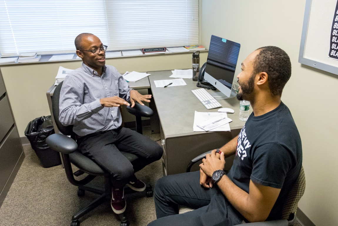 Psychology Professor Jonathan Lassiter (left) speaks with Steven Smith '19.Several years ago, as a sophomore, Steven Smith ‘19 worked in the lab of Jonathan Mathias Lassiter, assistant professor of psychology, learning about health disparities and Black psychology. Since then, with continued mentorship from Lassiter, he has presented at several research conferences and earned a National Institutes of Health (NIH)-funded summer research fellowship.