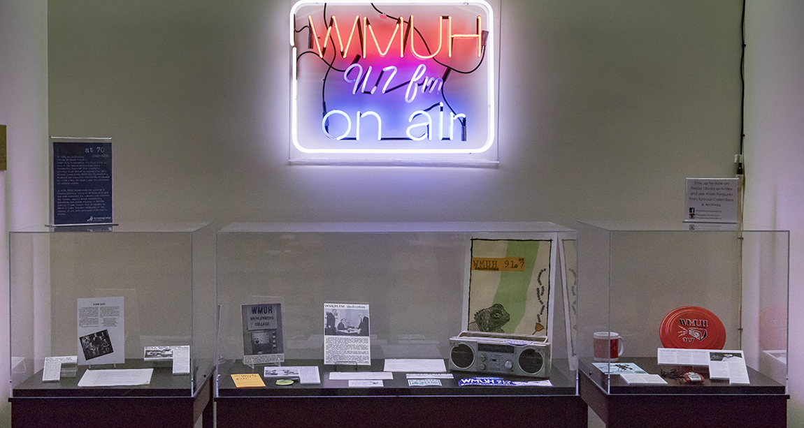 WMUH celebrated the 70th anniversary of its first official meeting with an exhibit at Trexler Library last spring. This academic year marks 70 years on the air.This year, Muhlenberg’s radio station, WMUH, celebrates 70 years of being “The Only Station That Matters.” An exhibit last spring at Trexler Library cataloged the station’s history with archival items such as a quilt made from a variety of WMUH T-shirts, news clippings from the 20th century and a photo of the station’s original members. WMUH began with a club meeting of 10 students on February 26, 1948. The first broadcast from the station aired later that year, on November 4.