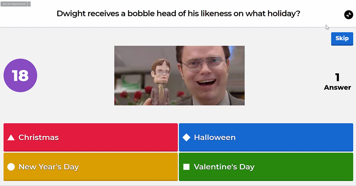 A screenshot from The Office-themed trivia, one of the options Muhlenberg has offered its students so far