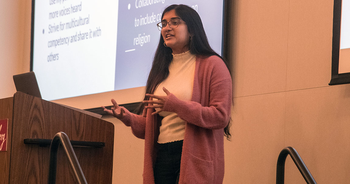 The RAs’ final project was a presentation to their colleagues before the start of the spring semester about what they’d like to do in the residence halls to make students of all faiths feel at home. Michelle Rajan ’21, who opted to take Religion in Residence after seeing two Muslim friends navigate fasting during Ramadan last spring, felt like she found a like-minded group that’s passionate about supporting residents’ religious practices.