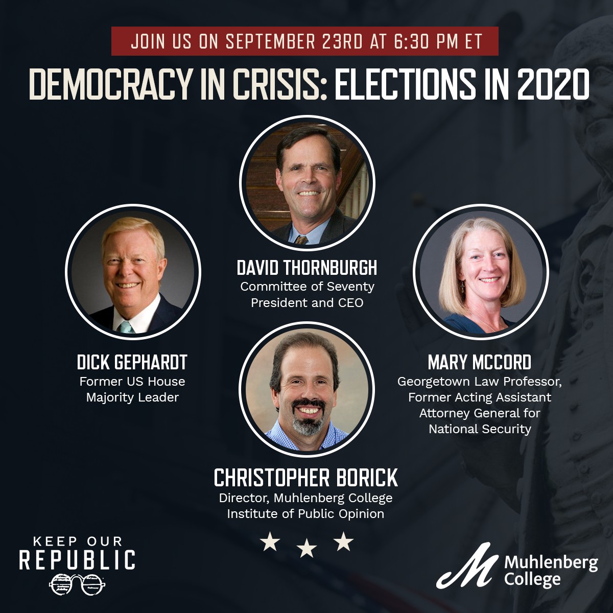 Former Congressman and Majority Leader Dick Gephardt, Committee of Seventy President and CEO David Thornburgh, and veteran constitutional lawyer Mary McCord of Georgetown Law School will host an open discussion about the election challenges and solutions, moderated by Christopher Borick, director of the Muhlenberg College Institute of Public Opinion.