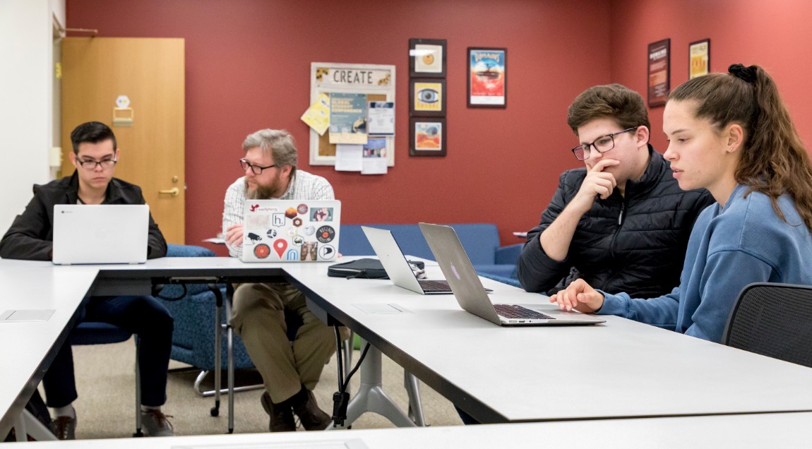 Student digital learning assistants work with Senior Instructional Designer Tim Clarke (second from left), on campus last fall.“Online learning is a human—not a technological—endeavor. We lose sight of that central reality at our own peril,” said Lora Taub, professor of media & communication and dean for digital learning, in a recent Inside Higher Ed article. She was one of ten experts asked to weigh in on how higher education institutions can keep community and engagement in the forefront of their teaching, despite the sudden dependence on remote learning this semester due to COVID-19.