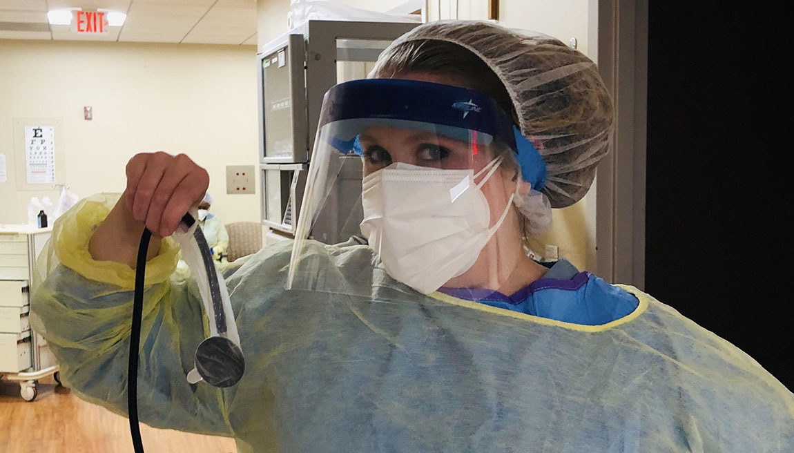 Physician assistant Kendra Moore ’13 in protective gear at workKendra Moore ’13, a physician assistant at St. Mary's General Hospital in New Jersey, began thinking seriously about COVID-19 months ago. While most Americans still thought it a far-away problem, Moore was researching what we did and didn't know about the virus and how it might affect the emergency room where she worked. And yet, when the first suspected COVID-19 patient presented at St. Mary's, Moore realized that research, while helpful, didn't answer all the questions about the virus.