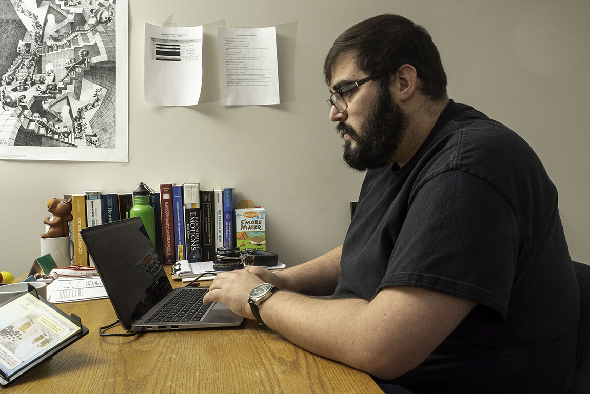 Michael Silverstein ’18 on the University of Oregon campus. Photos by Brian Davies.As a novel coronavirus spread throughout China and into other nearby countries earlier this year, Michael Silverstein ’18 kept checking the numbers. The Ph.D. student in psychology at the University of Oregon and his colleagues sought out updates multiple times daily to learn how many people had tested positive for the disease (COVID-19) caused by the virus and how many people had died after contracting it.