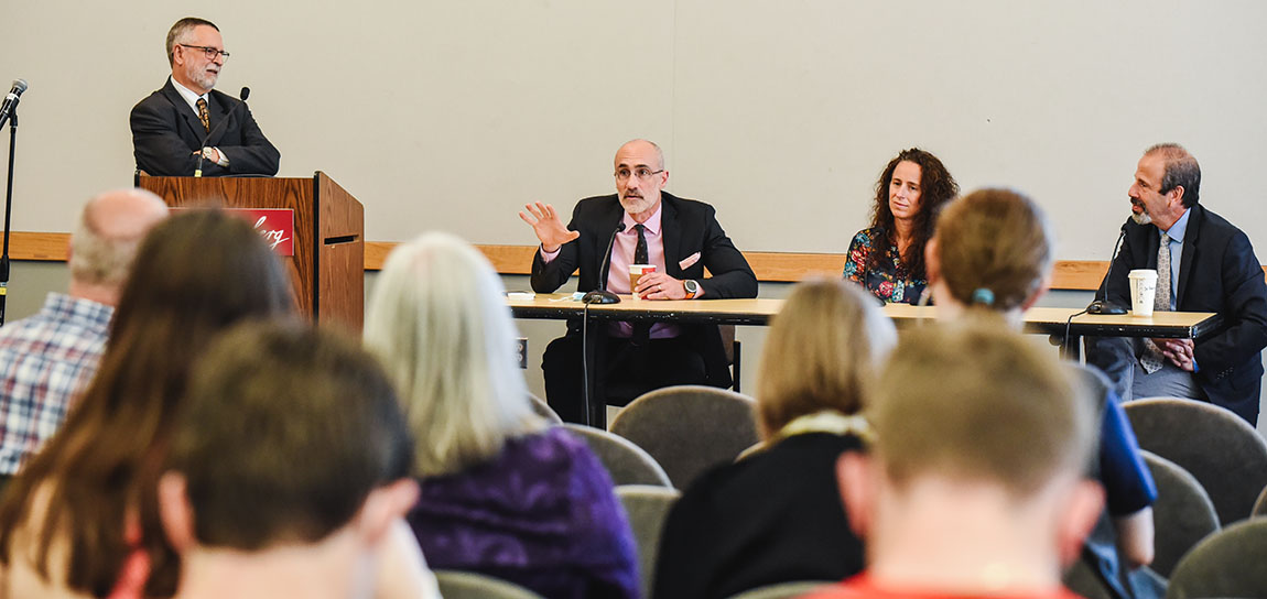 In addition to the public lecture, students, faculty and staff had an opportunity to interact with Brooks during a panel discussion titled “Capitalism and Democracy in the 21st Century.” Professor of Business Roland Kushner moderated the discussion between Brooks, Director of Innovation & Entrepreneurship Rita Chesterton and Professor of Political Science Chris Borick. For about 40 minutes, the panel addressed topics such as turmoil in the labor market, how to get students interested in government work and how to find happiness in entry-level jobs. A lively Q&A session followed.