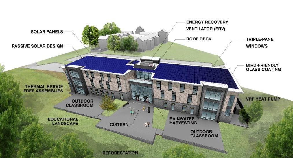 - 70% energy use reduction through efficient HVAC and lighting systems, a super-insulated envelope, passive-solar orientation and a 60kw rooftop solar panel array