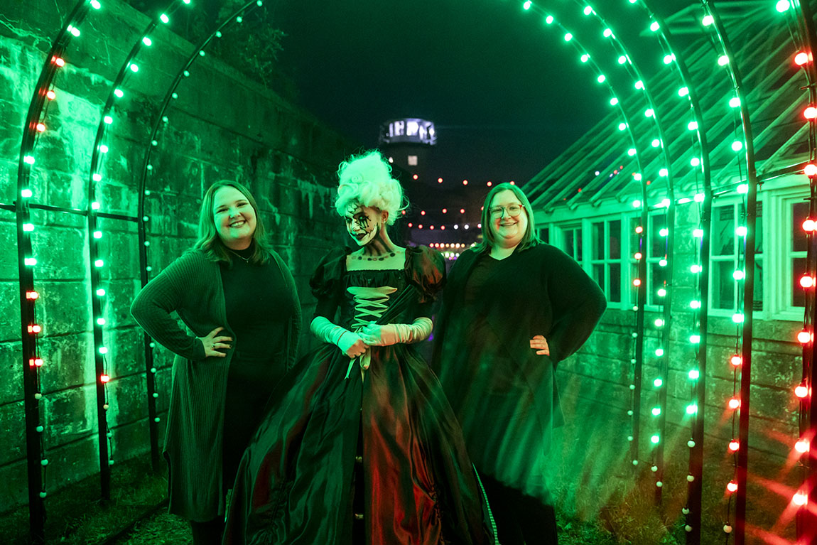Ally Duvak ’22 (left) and Jackie Phillips ’13 (right) with a performer at Eastern State Penitentiary’s Halloween Nights. Photos by Erin DavisWhen Ally Duvak ’22 started her role at Philadelphia’s Eastern State Penitentiary in June, the historic prison was already beginning to prepare for its nationally renowned Halloween celebrations.