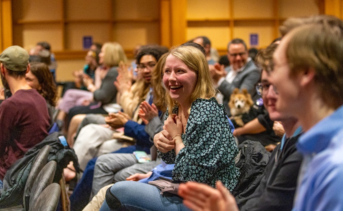 From left: Candidates Pennsylvania State Representative Malcolm Kenyatta and United States Representative Conor Lamb on the debate stage with moderators Ari Mittleman, Jenny DeHuff and Christopher Borick. Images: Marco Calderon/Muhlenberg CollegeAn enthusiastic crowd filled the Seegers Union Event Space on the afternoon of Sunday, April 3, for the first 2022 Pennsylvanian U.S. Senate Democratic debate.