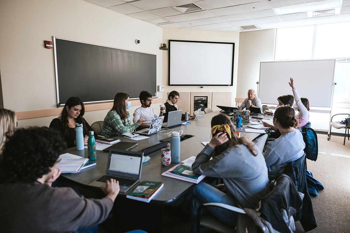 Professor of English Grant Scott teaches senior English majors in Picture Stories. Photos by Marco CalderonHow do you read a book that doesn’t have any words? Students in Professor of English Grant Scott’s new course Picture Stories are learning. It’s been a challenge, one the students have tackled with enthusiasm and energy.