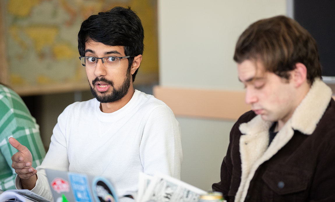 Muntasir Ali ’23 (pictured above, at left), an English and economics double major and political science minor, grew up reading comic books, and before taking this course, he thought of graphic novels as childish. Not anymore: “The works we’re reading are very mature,” he says. “It’s a really cool and unique experience to go through the evolution of the graphic novel and to see it unfold in the way we are right now.”