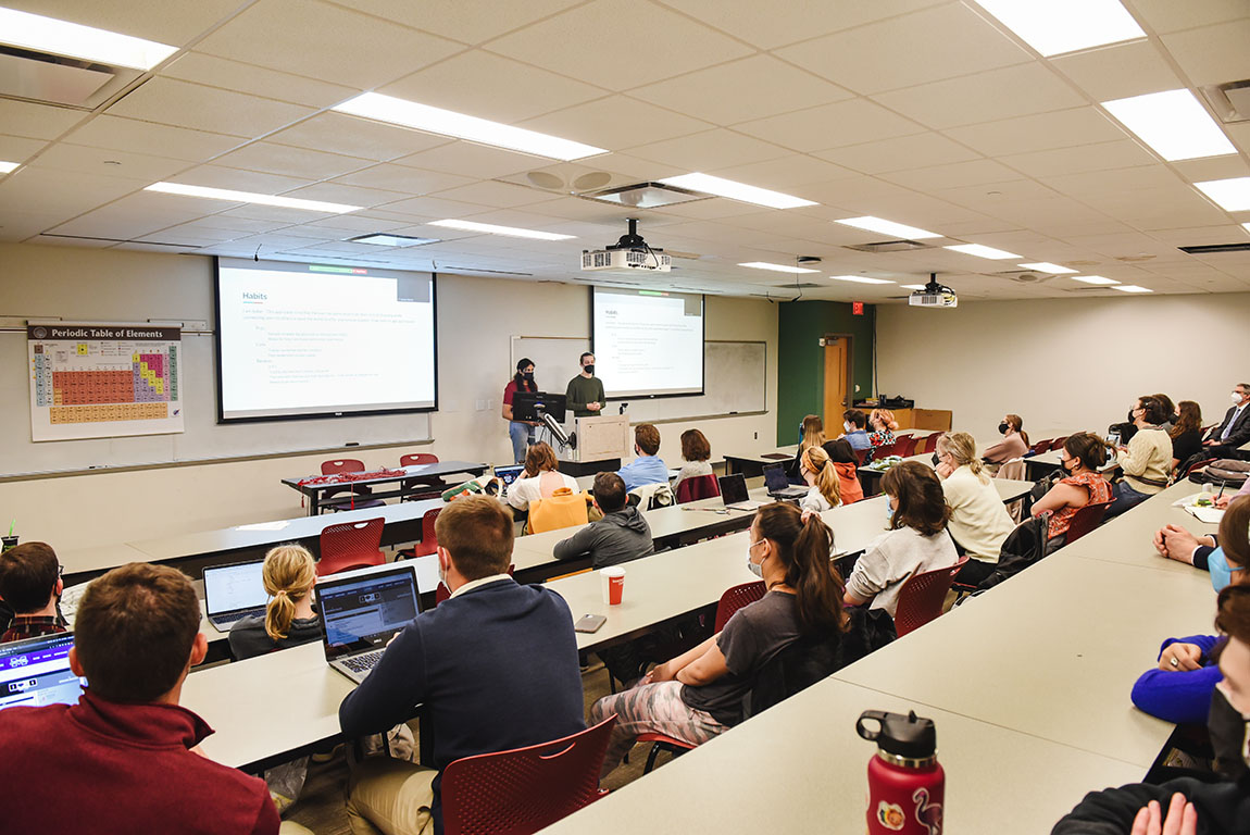 Trevor Virno ’22 and Danny Monzo ’22 present at the RJ Fellows senior symposium. Photos by Kristi Morris, Littlewing PhotographyThis month, Muhlenberg seniors in the RJ Fellows Honors Program presented to a room full of supportive friends, faculty and peers. Held in the spring of each academic year, this night gives the honors scholars a chance to share their year-long capstone projects that align with a particular theme. The theme of this year’s program was “Positive Change Through Social Entrepreneurship.”