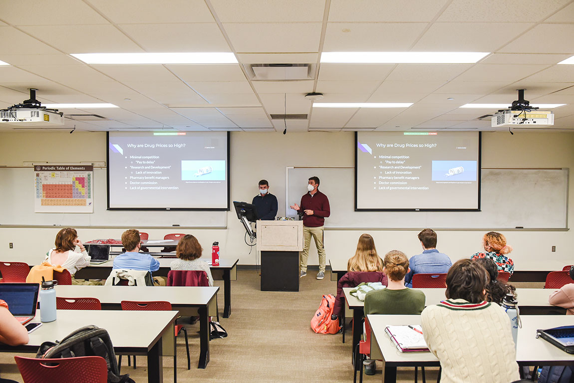 The night consisted of presentations from seven groups. For example, Danica Schofer ’22 (a dance and music double major) and Alex Bak ’22 (an English major) explored dance as a form of climate activism in their presentation “Dance as Activism: Exploring Climate Justice Through Social Entrepreneurship Frameworks.” Danny Monzo ’22 (a neuroscience major and public health minor) and Trevor Virno ’22 (a neuroscience major) explored the inflation of prescription drug prices in “Drug Price Inflation: Are Non-Profit Pharmaceutical Companies to Blame?”