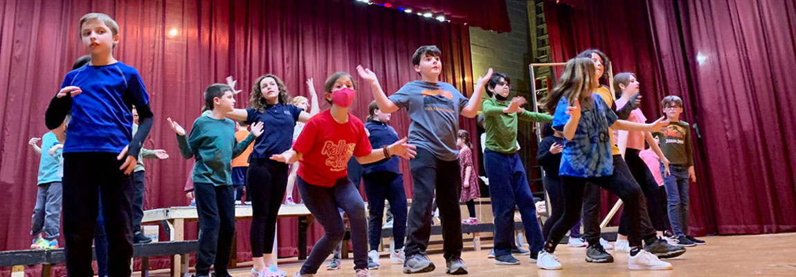 Students rehearse at the JCCA group of theatre & dance students are taking the skills they’ve learned at Muhlenberg out into the community. Savannah Hastings ’22, Arianna Tilley ’22 and Abigail Sherman ’22 are the creative team behind Schoolhouse Rock Live! at the Allentown Jewish Community Center’s (JCC) Stagemakers Theatre Arts Program. This is the JCC’s first full-scale production since the start of the pandemic in March 2020.