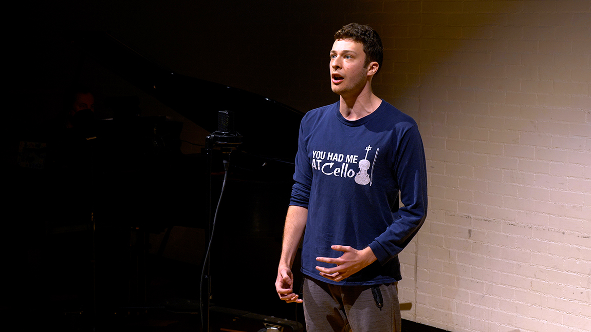 Will Howitt ’23 performs his song cycle “Squeeze Her Hand.”“Tell Me About You: Reprise” starts slowly, with Will Howitt’s baritone voice echoing off the walls of the Recital Hall.