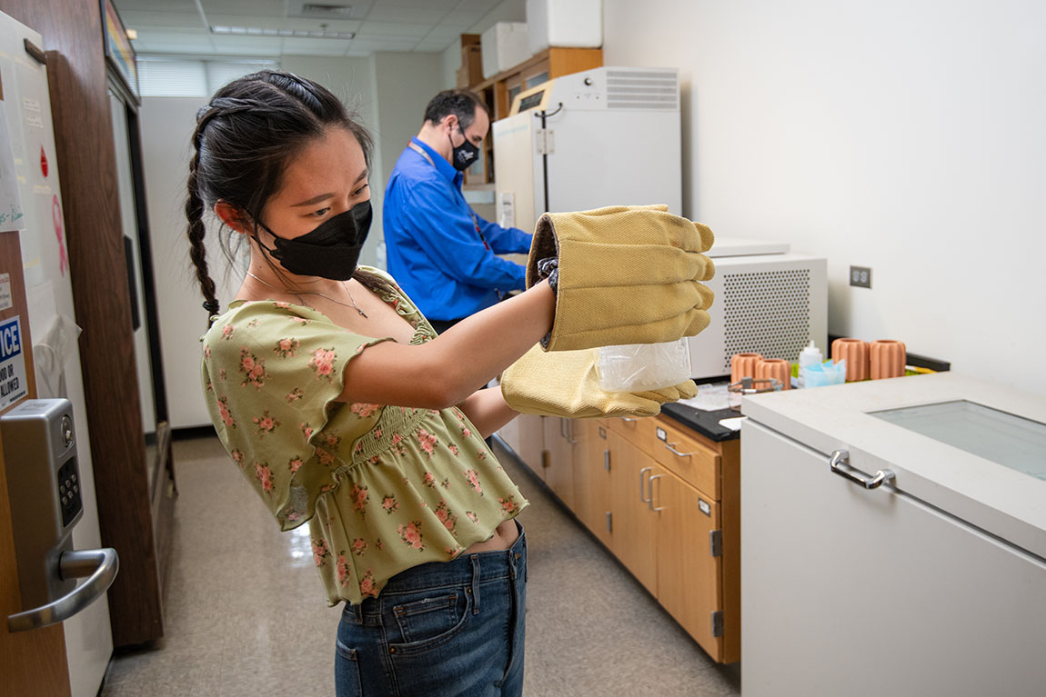 She contacted Cuadra during her first semester in Fall 2019 (she graduated a year early), and he invited her to shadow in his lab. She did that until the pandemic hit and students were sent home. When Xu was back on campus in Spring 2021, she was trained in Cuadra’s lab, and she took over a project from a student who was graduating.