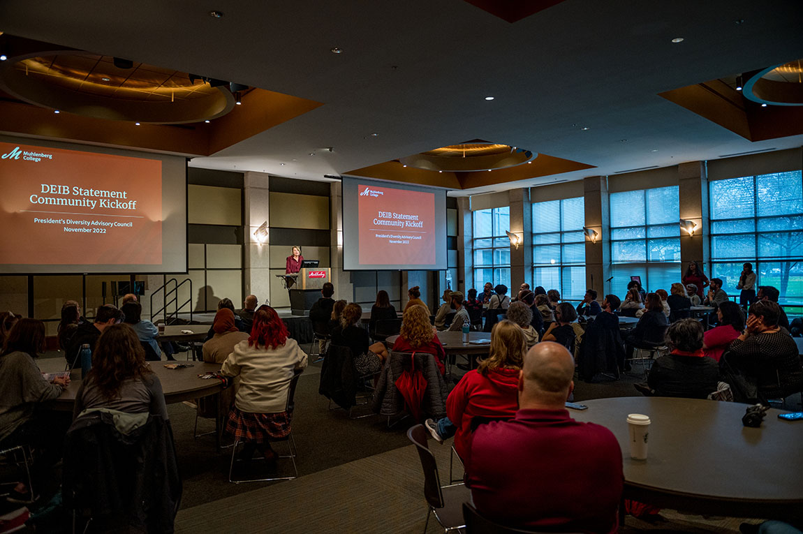 The campus community gathered in November to discuss the draft DEIB statement. Photo by Meg KellerMuhlenberg’s statement on diversity, equity, inclusion and belonging (DEIB) has been updated following a community effort that engaged students, faculty, staff, trustees and alumni. The Board of Trustees approved the new DEIB statement in January.