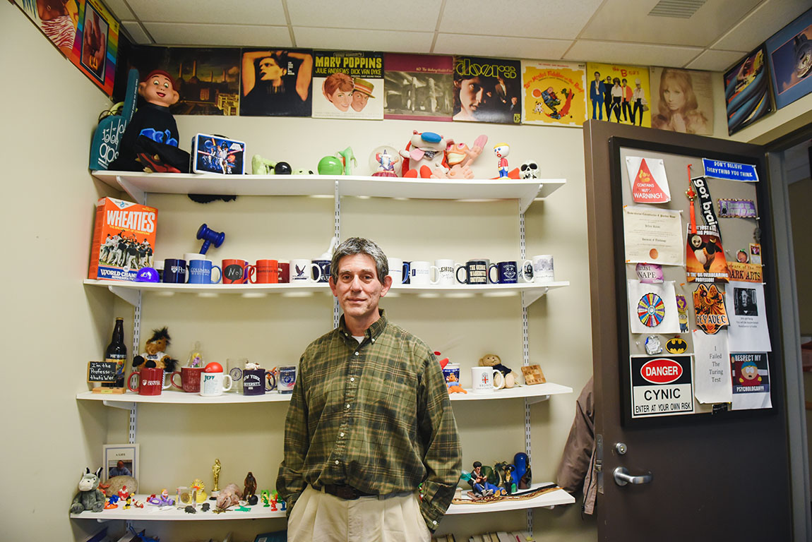 Professor of Psychology Jeff Rudski in his office with a collection of mugs students have given him. Photos by Kristi MorrisAs an undergrad, Professor of Psychology Jeff Rudski was inspired by an introductory psych professor who researched pain. Rudski had always been fascinated with the philosophical aspects of psychology, like the connection between mind and body. When Rudski learned in his intro class that placebo effects are nullified by the drug naloxone — better known today as Narcan, a nasal spray that can reverse opioid overdoses — he was smitten with the discipline.
